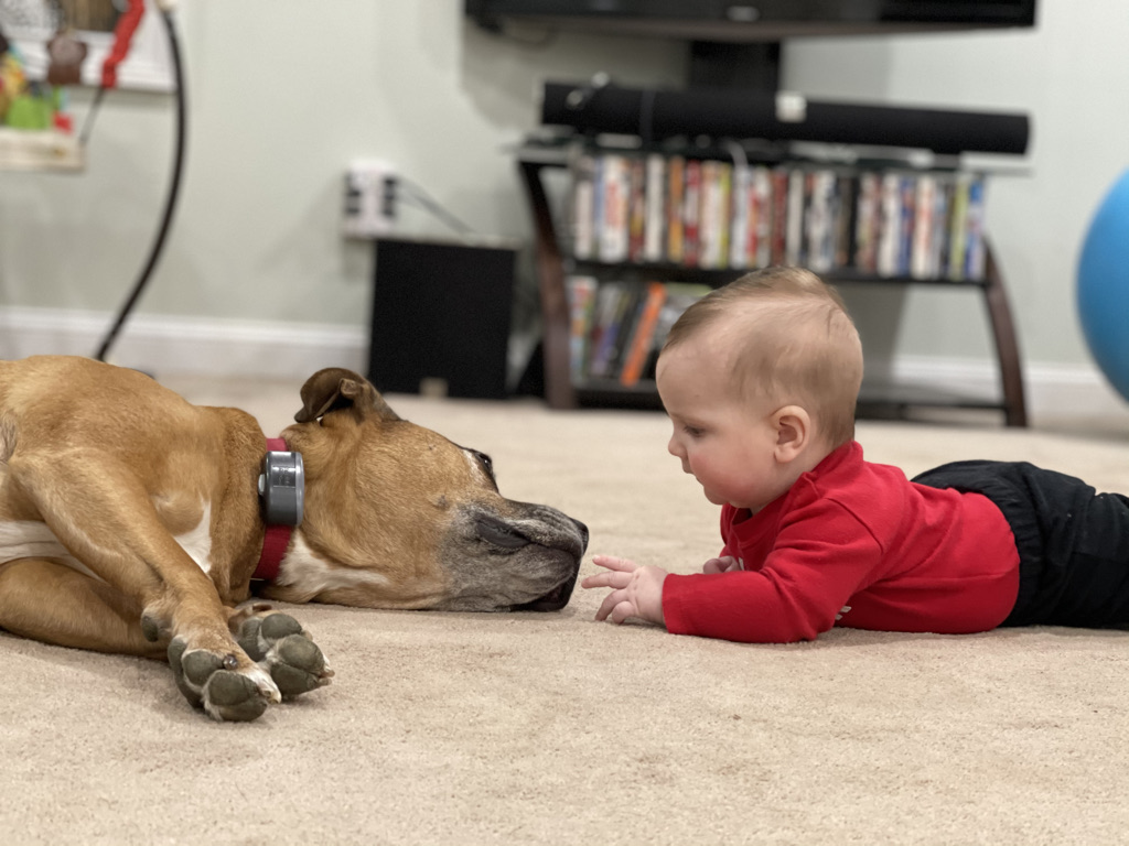 We are very lucky to have dogs that are very tolerant of our baby, especially one of them. Bru, the dog pictured, is usually within a five foot radius of Max when he’s awake, and our other dog Barley doesn’t mind Max at all, even more than Bru. If you are blessed with dogs that love your baby too, it might be worth a try to see if they will lay down out of arms reach from your baby, giving your baby something to distract them while they are on their tummy. Usually if Max is trying to reach for Bru or Barley, he doesn’t mind as much that he’s doing it on his belly. Always do this supervised, and make sure that your baby is far enough away that they aren’t able to reach their ears or face to pull on them.