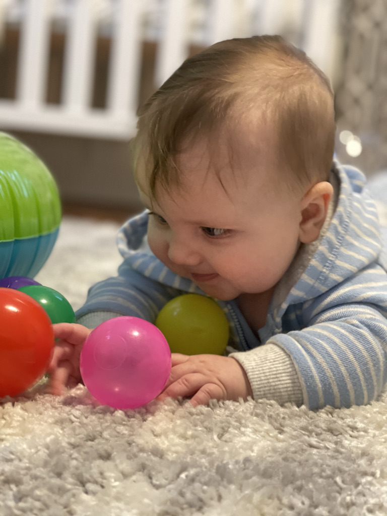 Similar to the loofahs that we put in front of Max when he was in front of the boppy, you can really use any toy that your baby loves to keep them on their tummy for even just a little bit longer than they would normally be. Max likes these ball-pit balls again because they are so brightly colored, and he can easily grab them because they are a little squishy. We have a ball-pit that came with bigger balls from Walmart, but there weren’t enough to fill the whole ball-pit so I got these from Amazon (you can buy them here) and Max really likes them!