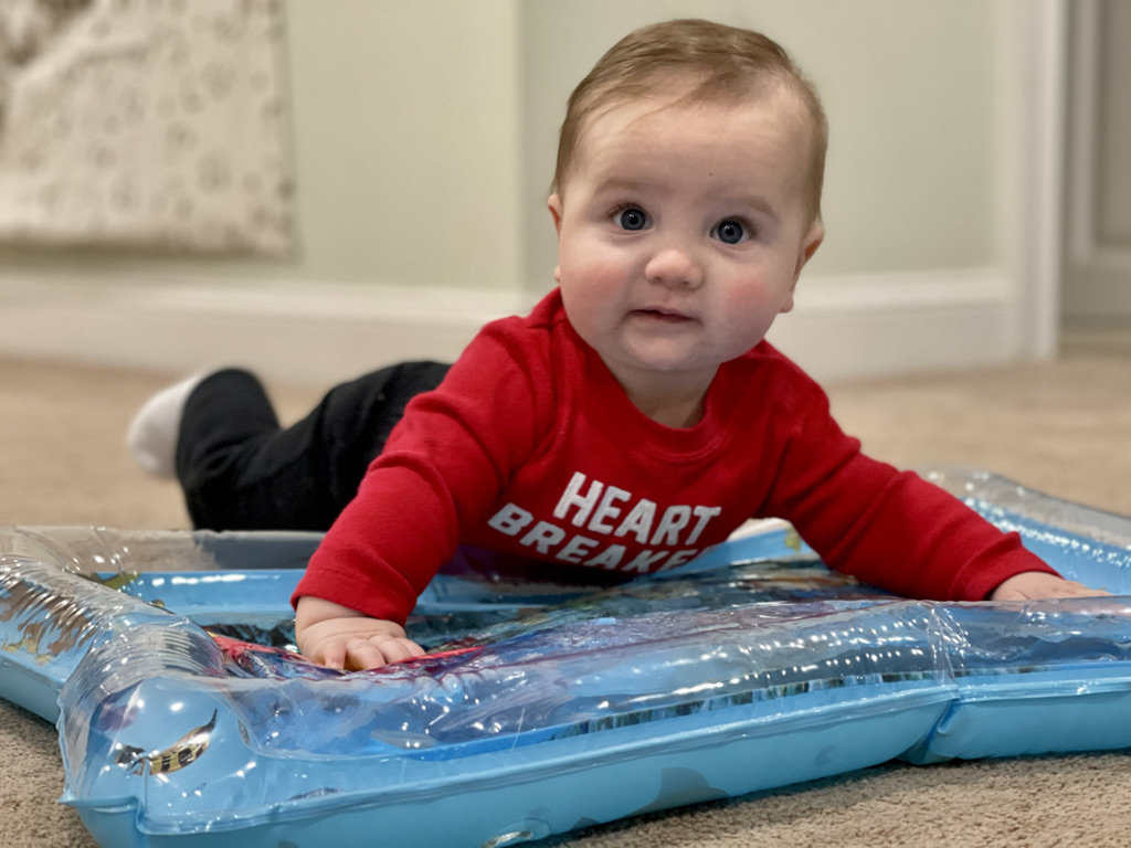 My mom gave us this play mat for Christmas, and it was originally the only way that Max would stay on his belly for longer than two seconds. It has little foam fish in it that move when the water moves, and they get to see the water move when they move their hands on it. Max loved it, and I would definitely recommend it. You can purchase one here!