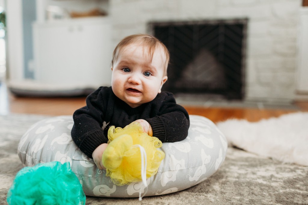 This one is hit or miss for Max, but he does seem to like to be propped up for tummy time more, likely because it’s easier for him and makes him work his chonky little arms a little less. When he’s propped up, it’s easier for him to grab for toys- or use these loofahs from the dollar store which have been one of his favorite toys since we brought them home. The bright colors and him being able to pull them apart without breaking them make them awesome cheap toys for babies.